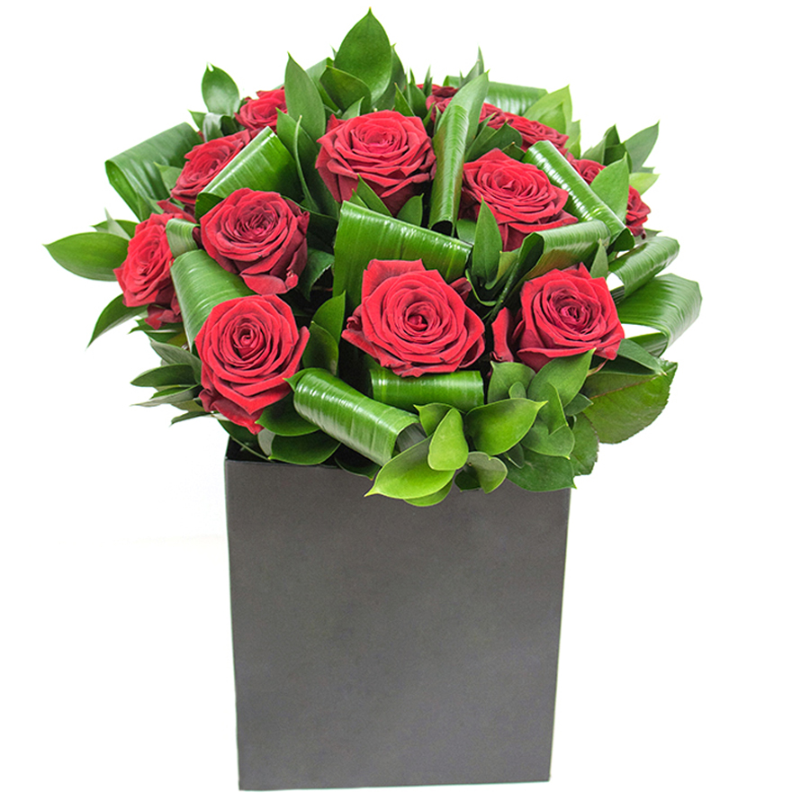 Radiate elegance and charm with our stunning bouquet, featuring vibrant red roses enhanced by asperidistra leaves and graceful ruscus. This unique arrangement brings beauty and sophistication to any home or special occasion.