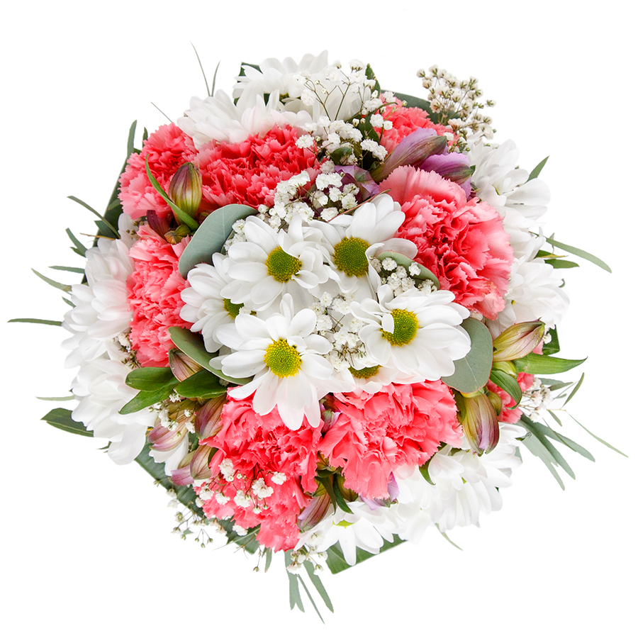 Indulge in the luxury of our seasonal floral masterpiece that captures the essence of grace and freshness. This breathtaking arrangement harmoniously combines pristine white chrysanthemums, airy gypsophila, and subtle light pink carnations, tastefully balanced with rich aspidistra leaves.